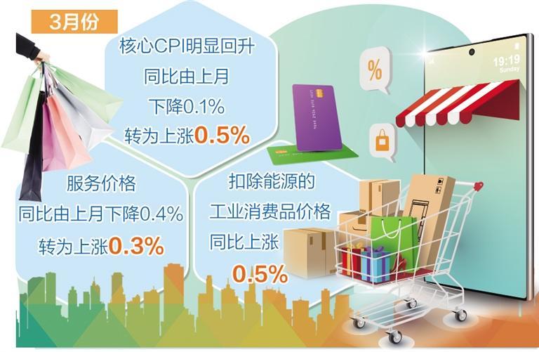 国家统计局数据显示,3月份,居民消费价格指数(CPI)环比下降0.4%,同比下降0.1%,降幅明显收窄。国家统计局城市司首席统计师董莉娟表示,从边际变化看,提振消费需求等政策效应进一步显现,核心CPI明显回升,同比上涨0.5%,供需结构有所改善,价格呈现一些积极变化。
