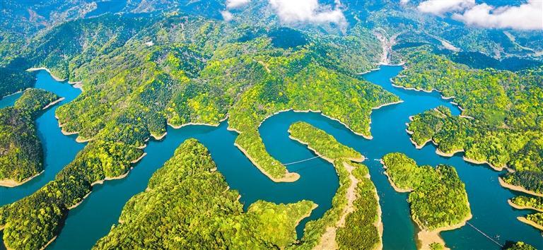 4月10日,江西省抚州市资溪县九龙湖国家级湿地公园内,森林与湖泊构成一幅秀美山水图。近年来,当地大力实施封山育林、森林质量提升等工程,坚定不移走生态优先、绿色发展道路。吴志贵摄(中经视觉)