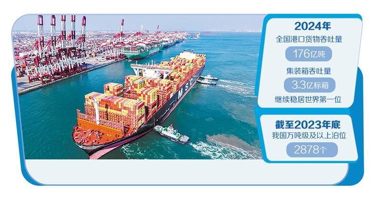2024年,宁波舟山港完成货物吞吐量约13.8亿吨,连续16年稳居全球第一位;上海港年集装箱吞吐量突破5000万标箱,创下全球港口集装箱最高纪录。