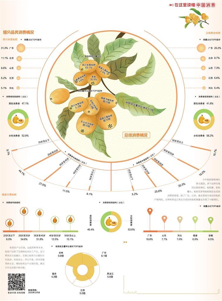 曾经被认为是“南方限定”的枇杷,正在迅速向北方市场拓展。吉林、黑龙江等地枇杷成交量环比涨幅分别达9.8倍、5.6倍,成为推动枇杷消费走向全国的重要力量。这一现象背后,是冷链物流能力、原产地直采体系与即时零售网络的不断完善。