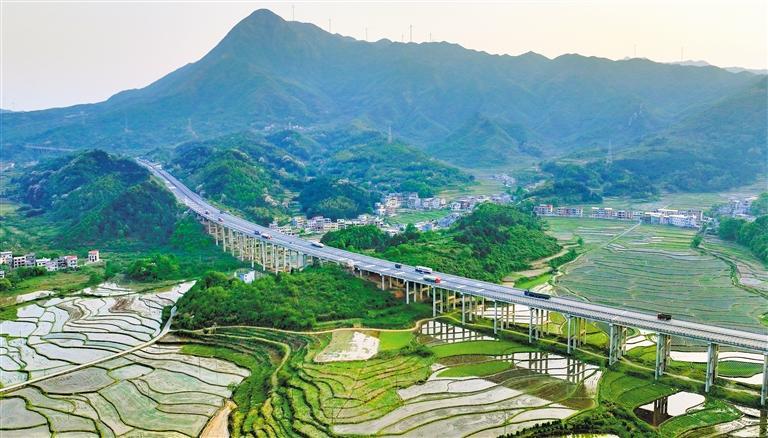 4月10日拍摄的湖南省常宁市庙前镇泉井村,许广高速穿境而过。道路两旁的村庄掩映于梯田、山峦之间,春日的乡村既宁静美丽又生机勃勃。