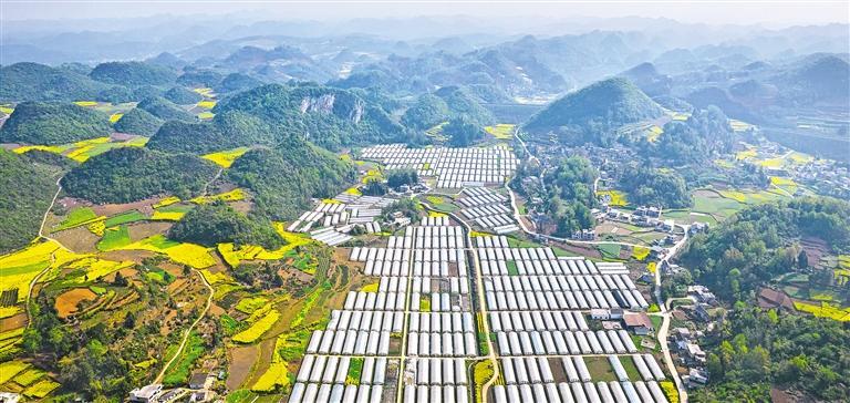 4月11日,贵州省黔西市雨朵镇龙场村,连片的果蔬种植大棚坐落在青山、田野间。近年来,当地大力发展特色农业,推动农业增效、农民增收。史开心摄(中经视觉)