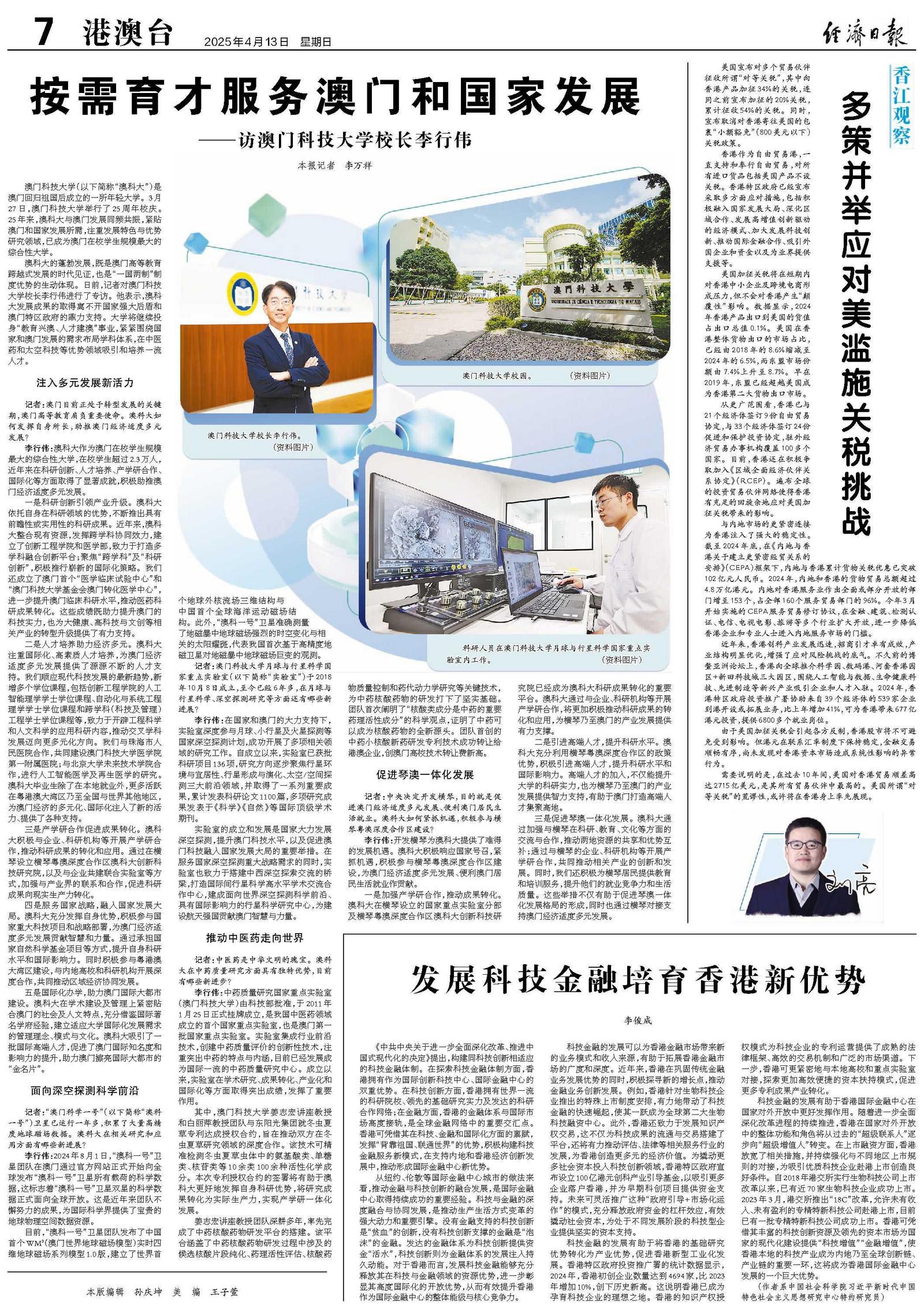 《中共中央关于进一步全面深化改革、推进中国式现代化的决定》提出,构建同科技创新相适应的科技金融体制。在探索科技金融体制方面,香港拥有作为国际创新科技中心、国际金融中心的双重优势。在科技创新方面,香港拥有世界一流的科研院校、领先的基础研究实力及发达的科研合作网络;在金融方面,香港的金融体系与国际市场高度接轨,是全球金融网络中的重要交汇点。香港可凭借其在科技、金融和国际化方面的禀赋,发挥“背靠祖国、联通世界”的优势,积极构建科技金融服务新模式,在支持内地和香港经济创新发展中,推动形成国际金融中心新优势。