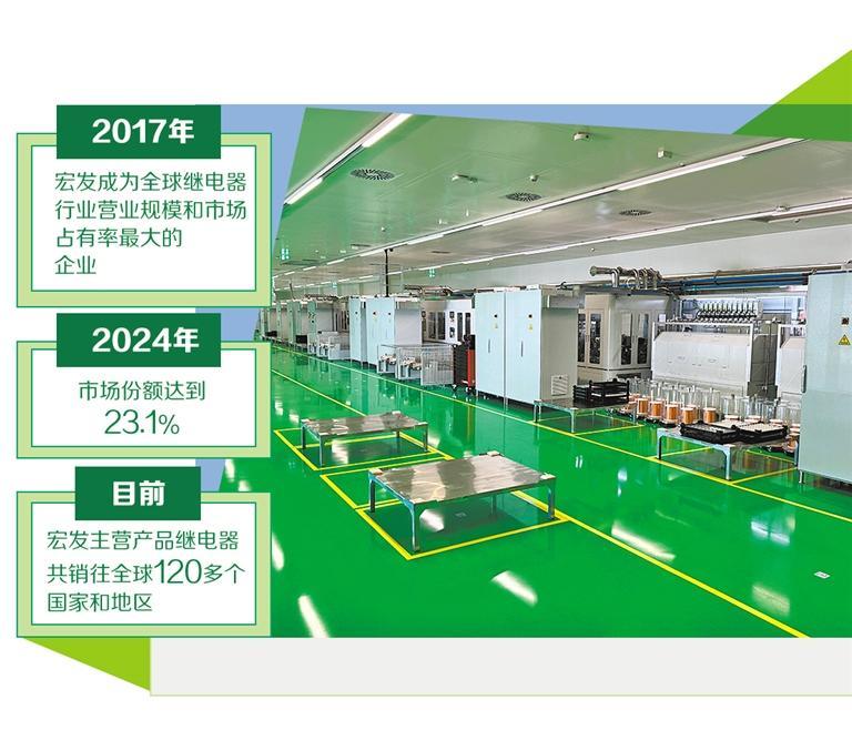 宏发主营产品继电器目前共销往全球120多个国家和地区。2017年,宏发成为全球继电器行业营业规模和市场占有率最大的企业,此后市场份额逐年扩大,2024年占比达到23.1%,是近年来行业领军企业中民营企业的突出代表。