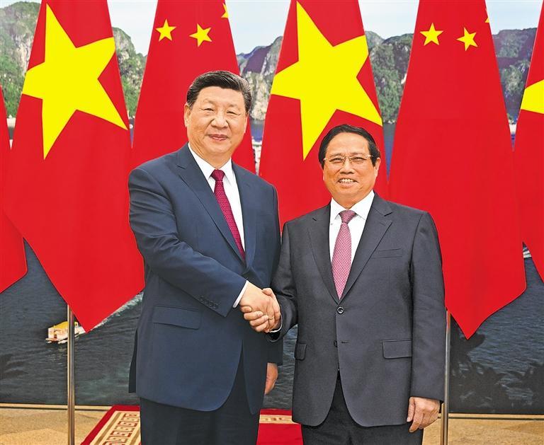 双方要推进高质量发展,为两国携手迈向现代化提供坚实战略支撑。充分发挥中越陆海相连的区位优势,加强发展战略对接,深挖产业合作潜能。稳步推进基础设施建设合作,提升互联互通水平,保障贸易畅通。做大做强贸易、投资等传统领域合作,拓展5G、人工智能、清洁能源、数字经济等新兴产业合作。坚定维护多边贸易体制,共同推动经济全球化朝着更加开放、包容、普惠、均衡的方向发展。