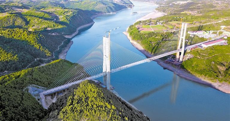 4月14日,湖北省十堰市郧阳区境内的西安至十堰高速铁路汉江特大桥顺利合龙,该桥是国内最大跨度梁桁组合结构斜拉桥。 曹忠宏摄(中经视觉)