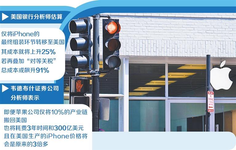 在美国政府宣布实施所谓的“对等关税”措施后,作为全球化程度最高的科技公司之一苹果公司,股价多次大幅下挫,市值蒸发数千亿美元,反映了投资者对公司前景的担忧。业内分析人士指出,苹果公司可能采取自行消化成本、提高售价等多种方案,以应对美国政府实施的所谓“对等关税”可能带来的冲击。但是要实现如美国政府所宣称的那样,大规模回到美国本土制造,难度极大。