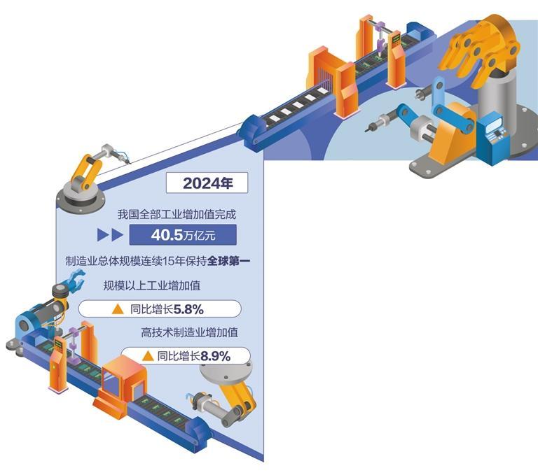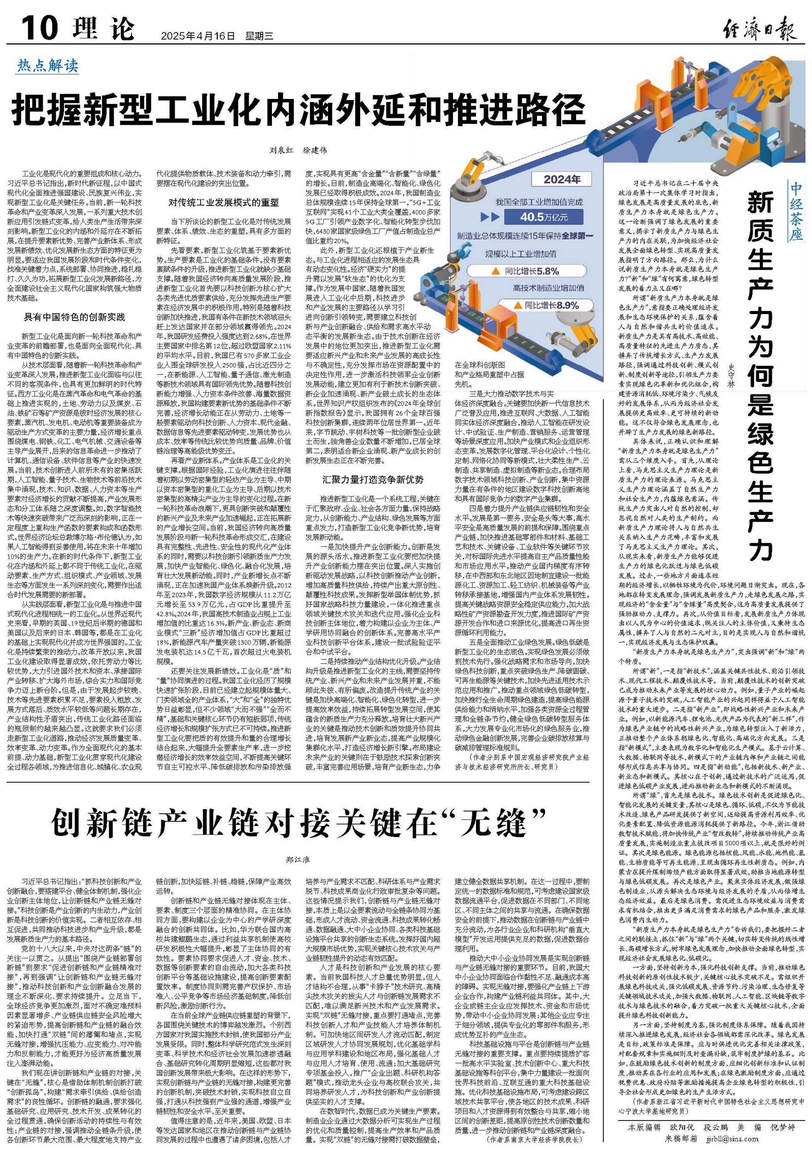 还要关注发展新绩效。工业化是“质”和“量”协同演进的过程。我国工业化经历了规模快速扩张阶段,目前已经建立起规模体量大、门类领域全的产业体系,“大”和“全”的独特优势日益彰显,但不少领域“大而不强”“全而不精”,基础和关键核心环节仍有短板弱项,传统经济增长和规模扩张方式已不可持续。推进新型工业化要把质的有效提升和量的合理增长结合起来,大幅提升全要素生产率,进一步挖潜经济增长的效率效益空间,不断提高关键环节自主可控水平、降低碳排放和污染排放强度,实现具有更高“含金量”“含新量”“含绿量”的增长。目前,制造业高端化、智能化、绿色化发展已经取得积极成效。2024年,我国制造业总体规模连续15年保持全球第一,“5G+工业互联网”实现41个工业大类全覆盖,4000多家5G工厂引领产业数字化、智能化转型步伐加快,6430家国家级绿色工厂产值占制造业总产值比重约20%。