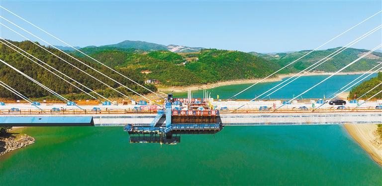 ▲4月14日,湖北十堰,西十高铁汉江特大桥合龙。该特大桥是国内最大跨度梁桁组合结构斜拉桥,也是西十高铁全线控制性工程。