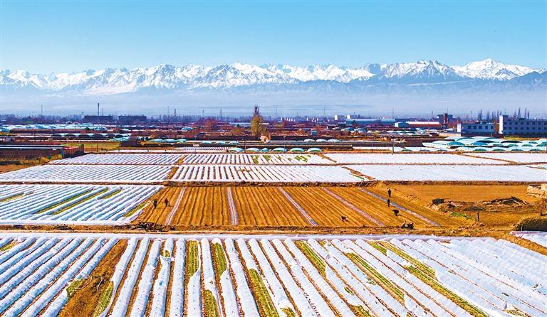 4月13日,甘肃省甘州区洪信村蔬菜基地,村民正在管护小拱棚蔬菜。近年来,当地依托区位优势,大力提升蔬菜产业规模化、标准化、品牌化进程,蔬菜种植面积达42万亩。