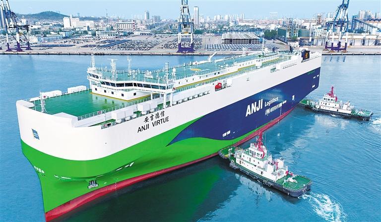 四月十八日,由江南造船为安吉物流建造的7800车位LNG双燃料远洋汽车运输船“安吉德信”轮在山东港口烟台港装车,正式投入运营。该船投用后将进一步提升中国汽车行业远洋运输能力。唐 克摄(中经视觉)