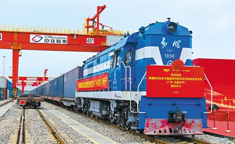 4月18日,“粤新快线”铁空联运专列首发仪式在广州国际港站举行。该专列采用“铁路干线+航空接驳”模式,大幅降低运输时间和成本。新华社记者 肖恩楠摄