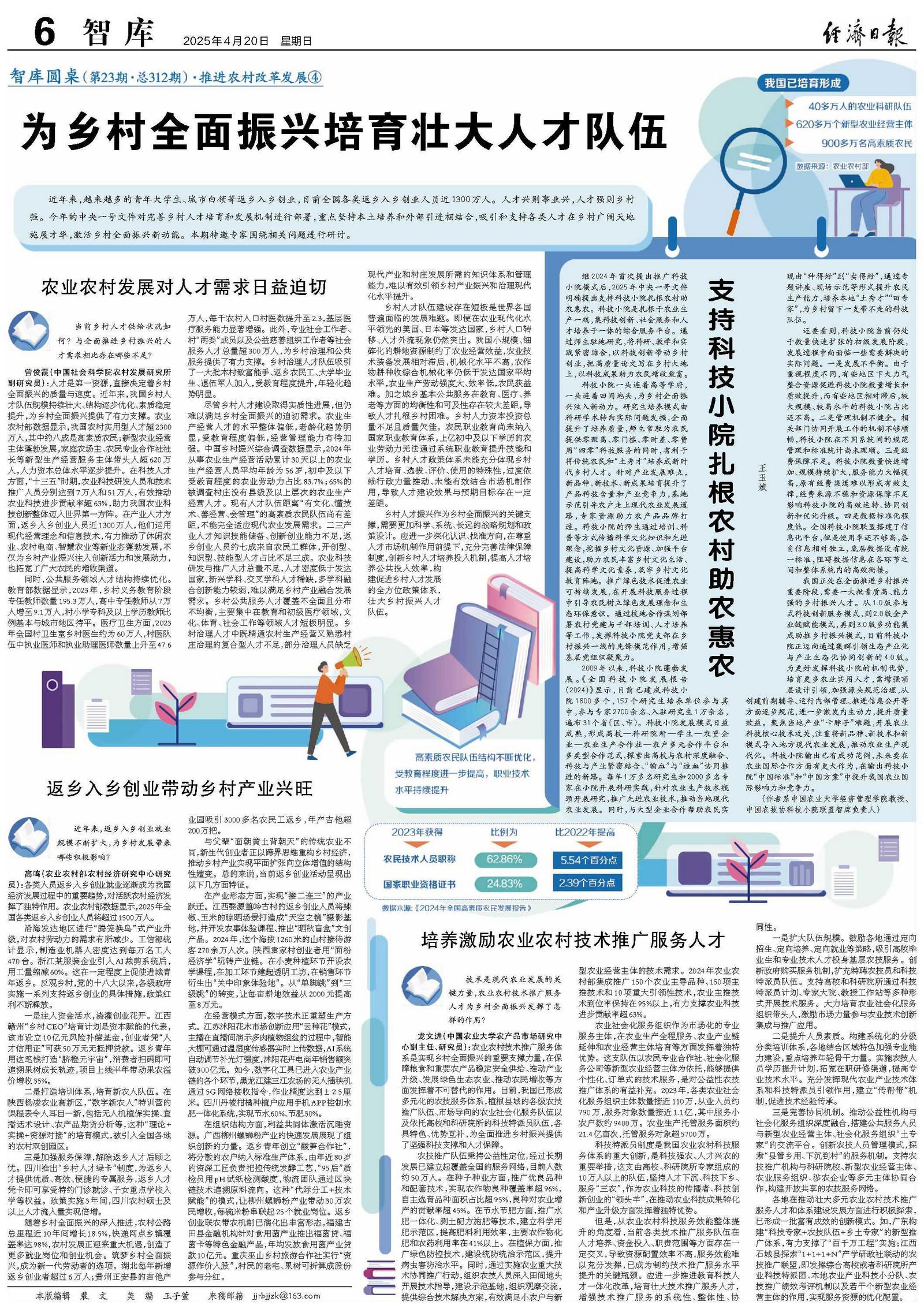 曾俊霞(中国社会科学院农村发展研究所副研究员):人才是第一资源,直接决定着乡村全面振兴的质量与速度。近年来,我国乡村人才队伍规模持续壮大、结构逐步优化、素质稳定提升,为乡村全面振兴提供了有力支撑。农业农村部数据显示,我国农村实用型人才超2300万人,其中约八成是高素质农民;新型农业经营主体蓬勃发展,家庭农场主、农民专业合作社社长等新型生产经营服务主体带头人超620万人,人力资本总体水平逐步提升。在科技人才方面,“十三五”时期,农业科技研发人员和技术推广人员分别达到7万人和51万人,有效推动农业科技进步贡献率超63%,助力我国农业科技创新整体迈入世界第一方阵。在产业人才方面,返乡入乡创业人员近1300万人,他们运用现代经营理念和信息技术,有力推动了休闲农业、农村电商、智慧农业等新业态蓬勃发展,不仅为乡村产业振兴注入创新活力和发展动力,也拓宽了广大农民的增收渠道。