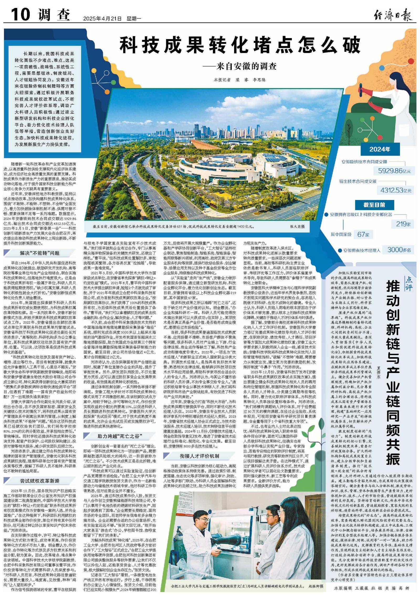 长期以来,我国科技成果转化面临不少堵点、难点,这是一项前瞻性、战略性、系统性工程,需要思想破冰、制度破局、人才破题协同发力。安徽近年来在破除体制机制障碍等方面大胆探索,通过积极开展职务科技成果赋权改革试点、不断完善人才评价体系等,调动广大科研人员积极性;通过建立新型研发机构和科技企业孵化平台、着力优化技术经理人队伍等举措,营造创新创业良好生态,加快科技成果转化进程,为发展新质生产力提供支撑。