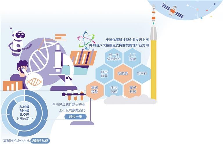 一批处于关键核心技术攻关领域的“硬科技”企业先后登陆A股市场,其中一些在上市后实现技术突破和跨越式发展,在集成电路、生物医药、高端装备制造等领域形成产业集聚效应,有效促进了资本、产业、技术、人才的深度融合。周小舟介绍,截至目前,科创板、创业板、北交所上市公司中高新技术企业占比均超过九成,全市场战略性新兴产业上市公司家数占比超过一半。
