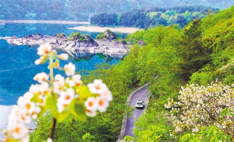 ▼4月17日,车辆行驶在重庆市黔江区小南海镇桐花掩映的绕湖公路上。