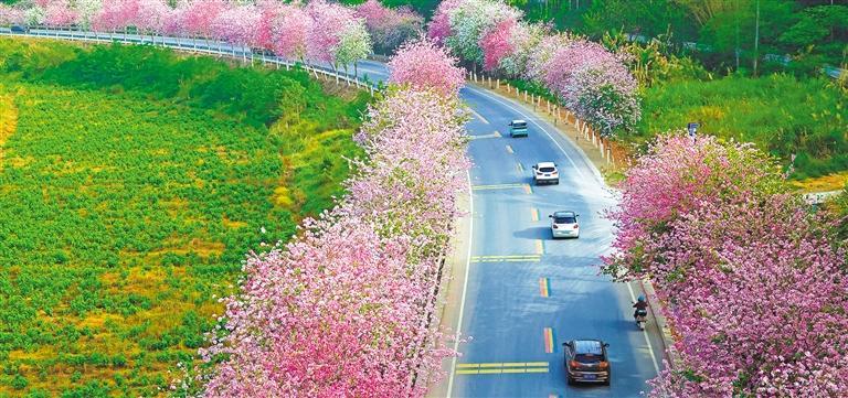 ◀4月13日,广西梧州市蒙山县蒙山镇北楼村公路两旁的紫荆花竞相绽放。吴广升摄(中经视觉)