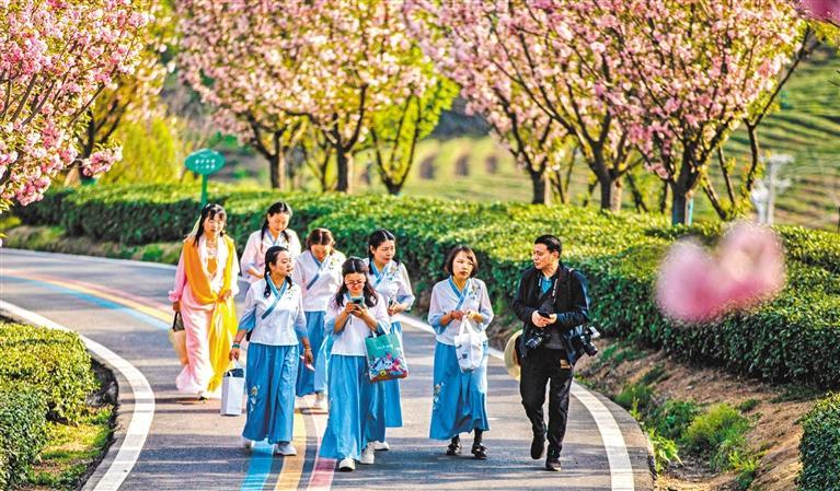 ◀4月6日,湖北十堰市竹山县山水茶园步道,游客在茶园观光休闲。