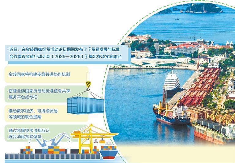 据介绍,为实现合作愿景,行动计划提出多项实施路径。包括金砖国家将构建多维共进的协作机制,依托贸易发展与标准合作组织,推动成立“贸易发展与标准合作组织金砖国家合作委员会”,依托联合国国际贸易中心建立的全球贸易服务平台,以及世界贸易组织中小微企业非正式工作组建立的中小微企业贸易服务平台,搭建金砖国家贸易与标准信息共享服务平台或专栏,加快统筹标准制定、技术交流与人才培养。同时,还将深化重点领域标准对接,依托年度标准会议、行业标准工作组会议常态化,推动数字经济、可持续贸易等领域的联合提案,并通过跨国技术法规互认逐步消除贸易壁垒。
