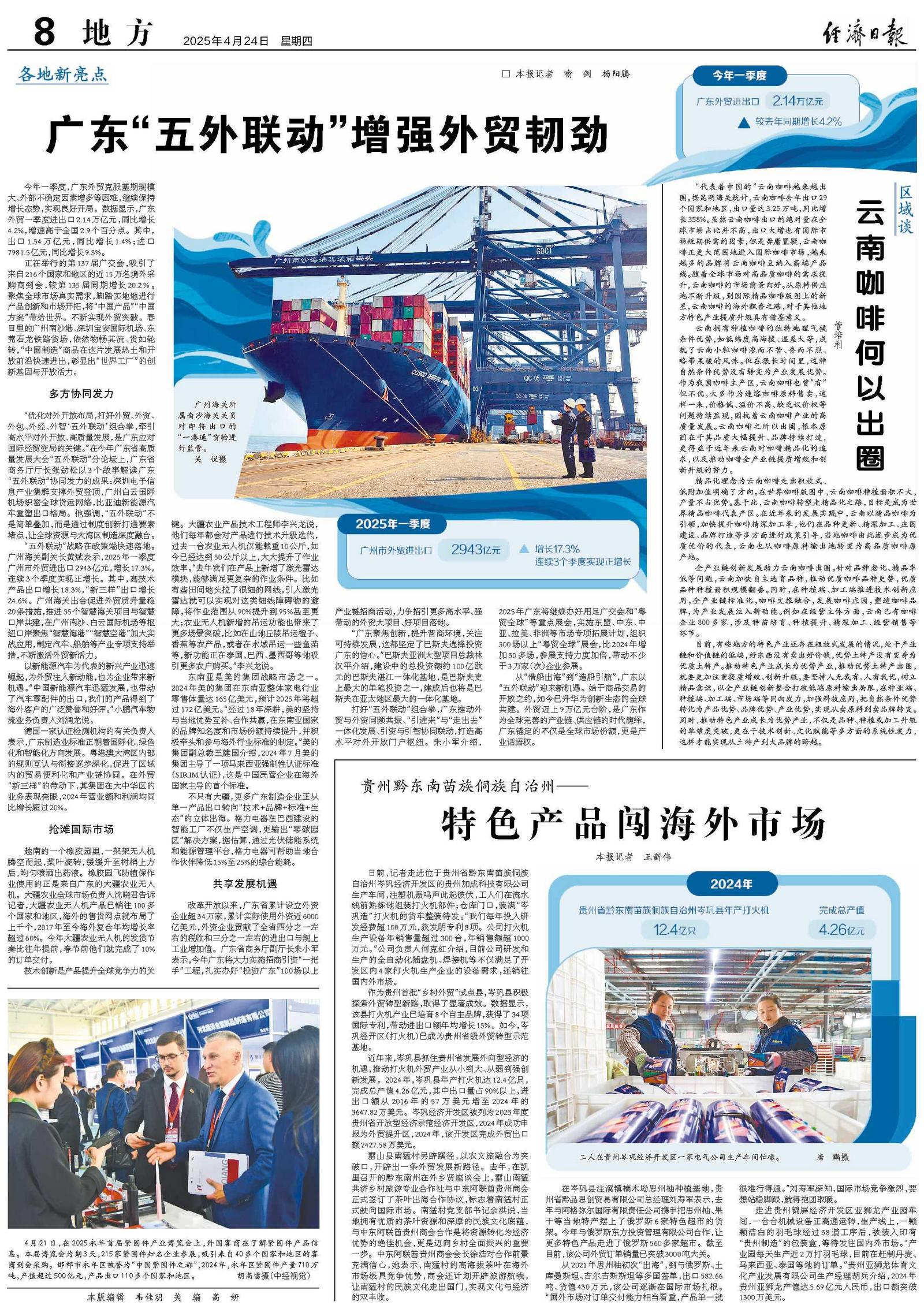“五外联动”战略在政策端快速落地。广州海关副关长黄斌表示,2025年一季度广州市外贸进出口2943亿元,增长17.3%,连续3个季度实现正增长。其中,高技术产品出口增长18.3%,“新三样”出口增长24.6%。广州海关出台促进外贸质升量稳20条措施,推进35个智慧海关项目与智慧口岸共建,在广州南沙、白云国际机场等枢纽口岸聚焦“智慧海港”“智慧空港”加大实战应用,制定汽车、船舶等产业专项支持举措,不断激活外贸新活力。