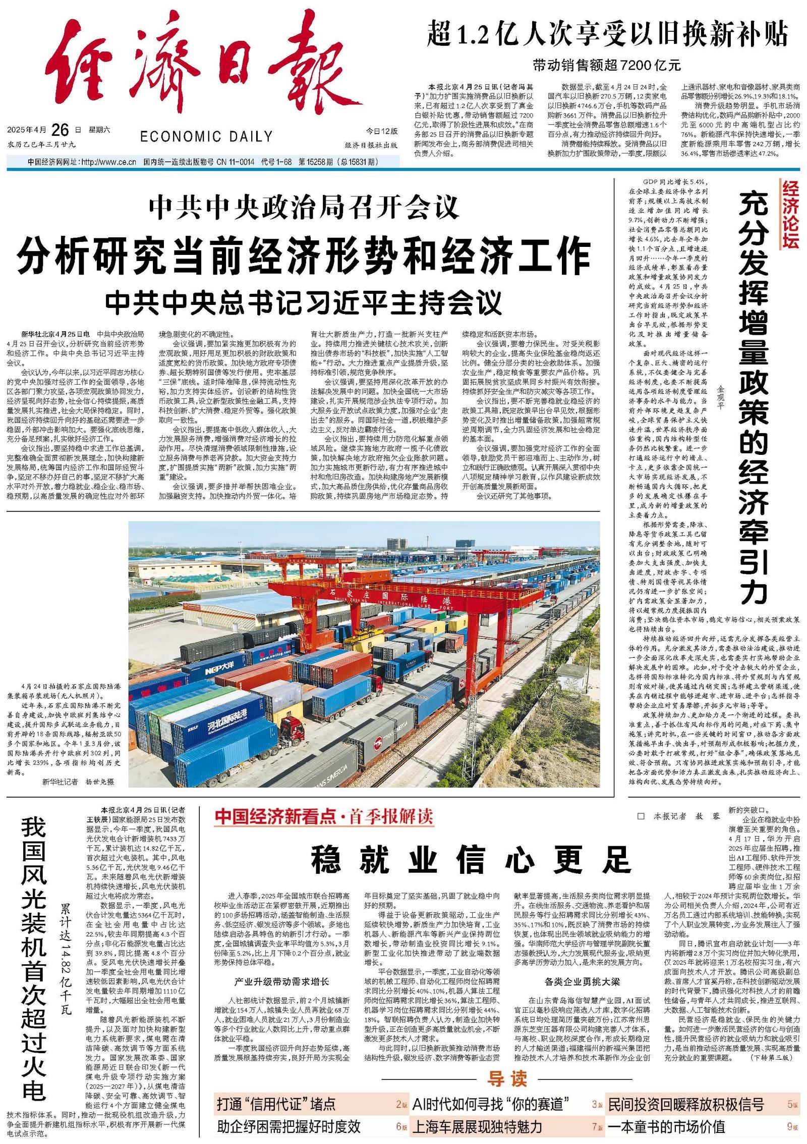 GDP同比增长5.4%,在全球主要经济体中名列前茅;规模以上高技术制造业增加值同比增长9.7%,创新动力不断增强;社会消费品零售总额同比增长4.6%,比去年全年加快1.1个百分点,且增速逐月回升……今年一季度的经济成绩单,彰显着存量政策和增量政策协同发力的成效。4月25日,中共中央政治局召开会议分析研究当前经济形势和经济工作时指出,既定政策早出台早见效,根据形势变化及时推出增量储备政策。