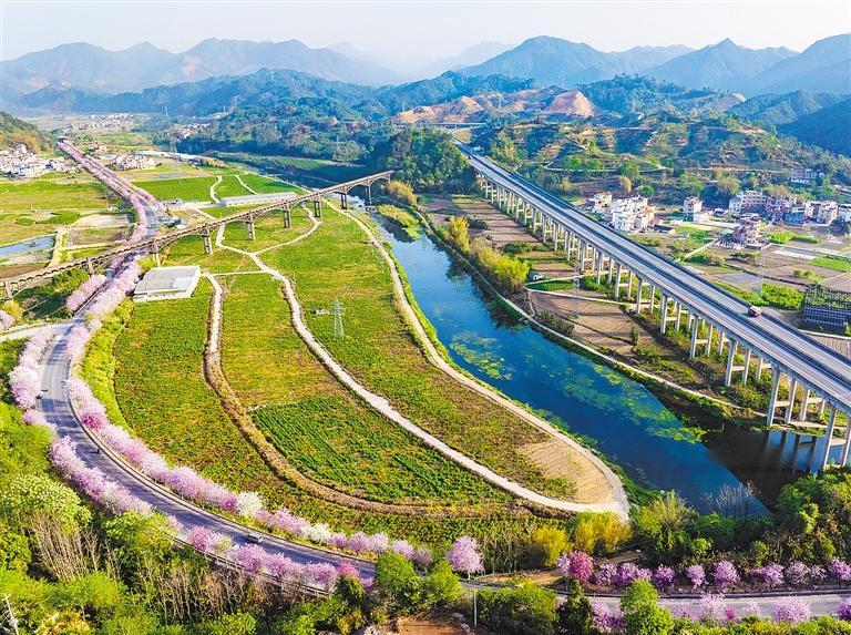 4月22日,在广西蒙山县蒙山镇高堆村,高速公路大桥、国道、乡村道路、河流、村庄构成一幅美丽的乡村画卷。黄胜林摄(中经视觉)
