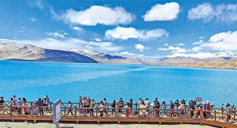 4月26日,游客在新疆喀什白沙湖景区观光。喀什白沙湖是帕米尔高原上的一座高山湖泊,随着天气回暖,景区迎来旅游高峰期。栗卫平摄(中经视觉)