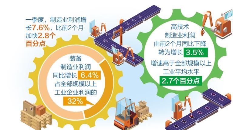 装备制造业成为利润增长重要支撑。一季度,装备制造业利润同比增长6.4%,较前2个月加快1个百分点,占全部规模以上工业企业利润的比重为32%,成为规上工业利润增长的重要支撑。8个装备制造业行业中有7个行业利润实现增长,其中,铁路船舶航空航天、仪器仪表、专用设备等行业利润增长较快,分别增长59.7%、15.3%、14.2%。