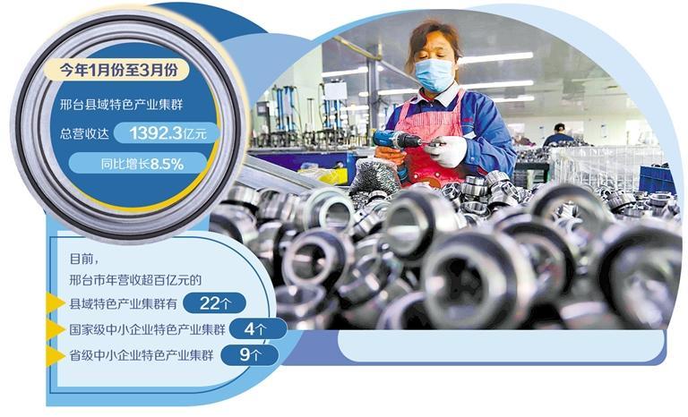 近年来,邢台市持续推动县域特色产业集群优化升级、做大做强,构建具有当地特色和比较优势的现代化产业体系。目前年营收超百亿元的县域特色产业集群有22个,国家级中小企业特色产业集群4个,省级中小企业特色产业集群9个。今年1月份至3月份,邢台县域特色产业集群总营收达1392.3亿元,同比增长8.5%。