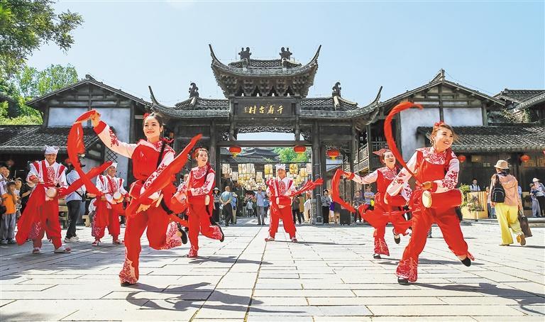 5月1日,演员在江苏省句容市宝华山国家森林公园进行腰鼓表演,吸引不少游客观看。“五一”假期来临,人们走出家门,看风景、赏民俗、品美食,乐享假日。钟学满摄(中经视觉)