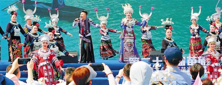 5月1日,重庆市万盛经开区万盛石林景区,苗族同胞载歌载舞,游客体验苗族特色活动。“五一”假期,该景区举办第25届苗族踩山会,欢迎远道而来的客人。 王泸州摄(中经视觉)