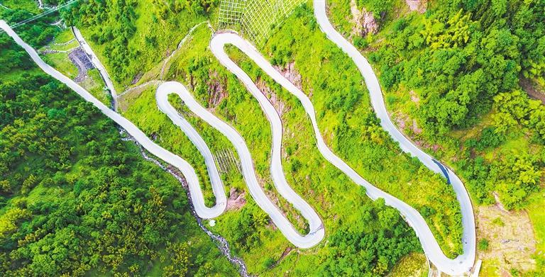 5月5日,航拍的云南省昭通市绥江县中城镇后坝村,盘山公路蜿蜒曲折。近年来,当地大力推进交通路网建设,让便捷公路成为群众家门口的致富路、幸福路、振兴路。