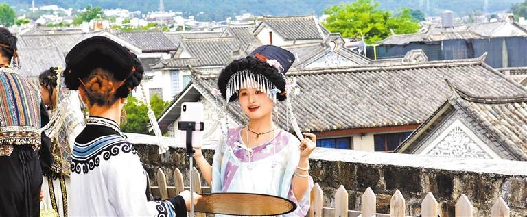 ◀5月3日,云南大理市大理古城,游客穿着当地民族服饰拍照打卡。