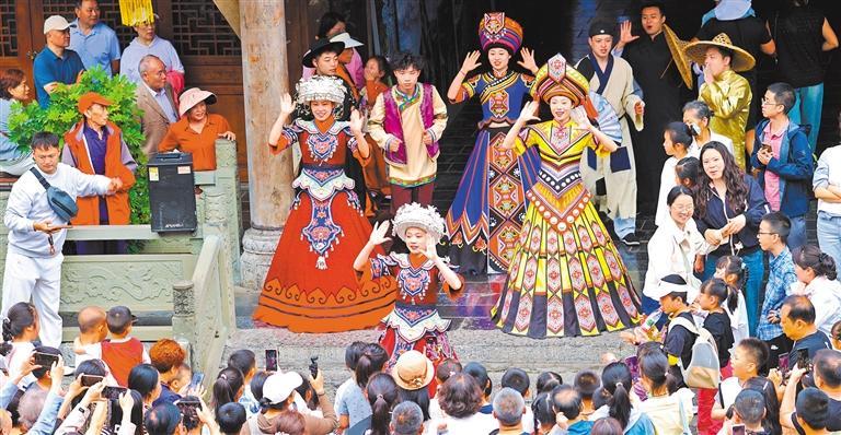 ▼5月4日,重庆黔江区濯水古镇的工作人员在进行土家族歌舞表演。杨 敏摄(中经视觉)