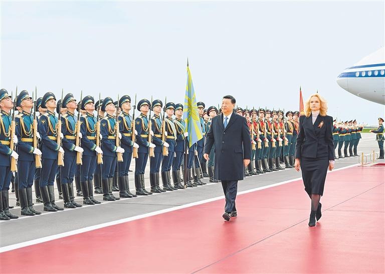 俄方在机场举行隆重迎接仪式。军乐团奏中俄两国国歌。习近平检阅仪仗队并观看分列式。