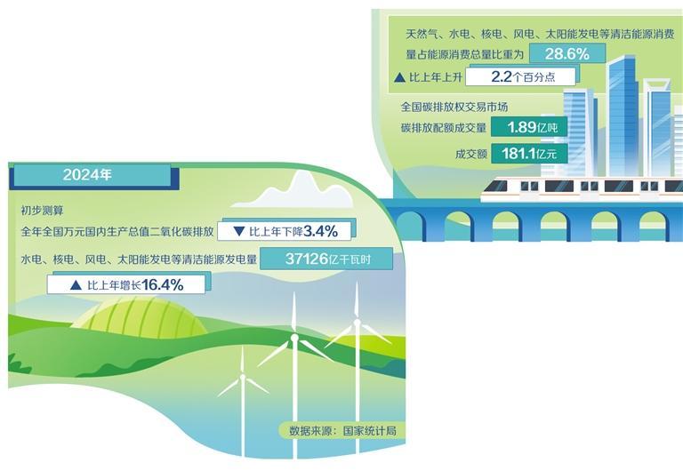 推动经济社会发展绿色化、低碳化,既是实现高质量发展的关键环节,又是缓解资源环境约束、解决生态环境问题的基础之策。经过多年努力,我国绿色低碳发展取得显著成就,相关实践日益深入,为实现全方位、全领域、全地域绿色转型奠定了坚实基础。产业结构绿色转型加速推进,截至2024年底,全国共有126家钢铁企业全过程完成超低排放改造,45家钢铁企业部分完成超低排放改造。能源结构转型取得历史性突破,2024年清洁能源发电量37126亿千瓦时,比上年增长16.4%;新能源汽车产量1316.8万辆,比上年增长38.7%。可再生能源装机规模领先全球,2024年全国可再生能源发电新增装机3亿千瓦以上,占电力新增装机的86%。生态治理与碳汇能力全面提升,森林覆盖率超25%,森林蓄积量超200亿立方米;截至2024年底,全国碳排放权交易市场累计配额成交量6.3亿吨、成交额430.3亿元,交易规模持续扩大、价格稳中有升。