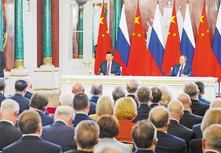 习近平指出,刚才,我同普京总统举行了深入友好、富有成果的会谈,达成许多新的重要共识。我们共同签署《中华人民共和国和俄罗斯联邦在纪念中国人民抗日战争、苏联伟大卫国战争胜利和联合国成立80周年之际关于进一步深化中俄新时代全面战略协作伙伴关系的联合声明》,见证两国有关部门交换多份合作文本,为中俄关系发展注入新的动能。