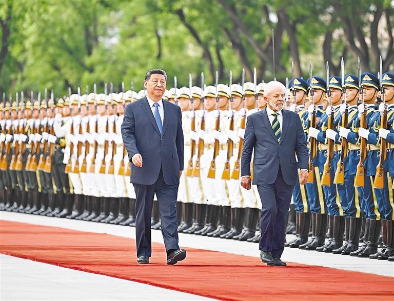5月13日下午,国家主席习近平在北京人民大会堂同来华进行国事访问的巴西总统卢拉举行会谈。这是会谈前,习近平在人民大会堂东门外广场为卢拉举行欢迎仪式。