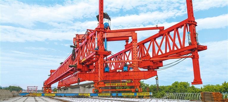 5月14日,湖南省永州市零(陵)道(县)高速道县段洑水河大桥建设工地,工人在架设桥梁作业。该项目建成通车后,将形成呼北高速粤港澳大湾区支线,促进区域经济社会加快发展。蒋克青摄(中经视觉)