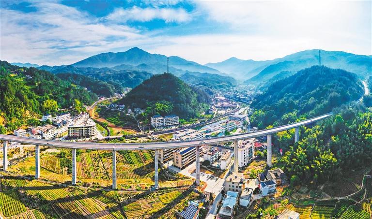 安徽省安庆市岳西县,来榜大桥宛如长虹雄跨山间,穿越村庄、田园、河流,与民居交相辉映,构成一幅大别山腹地美丽乡村画卷。