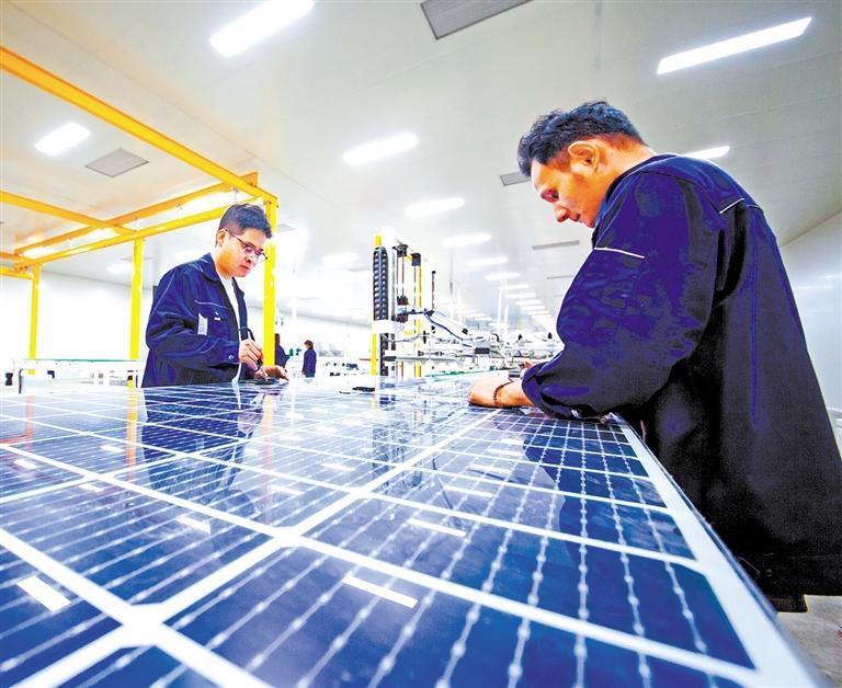 2025年5月15日,河南省商丘市鸿大光电有限公司光伏面板玻璃生产车间内,工人在生产线上赶制订单。