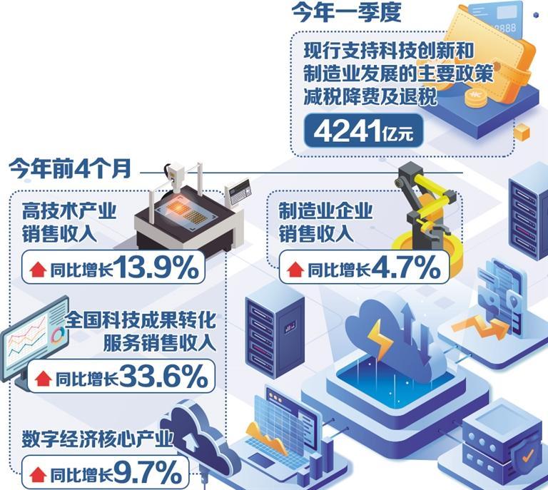 5月19日,国家税务总局发布最新数据显示,今年一季度,现行支持科技创新和制造业发展的主要政策减税降费及退税达4241亿元。在结构性减税降费政策等多方面措施综合作用下,我国科技创新与制造业高质量发展加快推进。