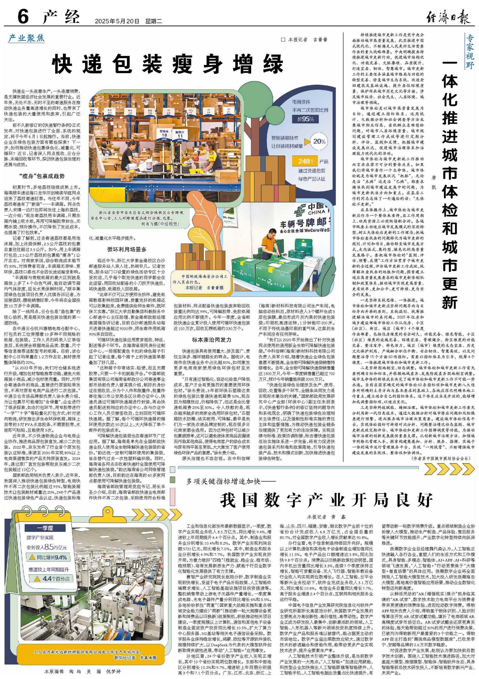 前不久新修订的《快递暂行条例》正式发布,对快递包装进行了全面、系统的规定,将于今年6月1日起施行。当前,快递企业在绿色包装方面有哪些探索?下一步,如何推动快递包裹绿色化、减量化、可循环?近日,记者深入网点揽收、云仓分拣、末端回收等环节,探访快递包装治理的进展与成效。