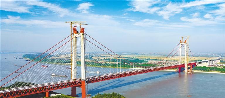 ◀5月13日,位于安徽省铜陵市的G3铜陵长江公铁大桥建设现场,施工人员在进行主塔塔冠安装作业。