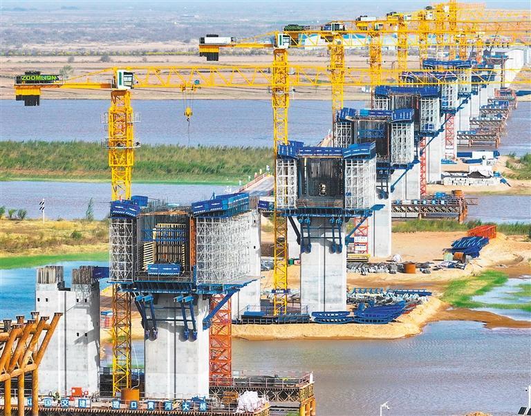 ◀5月8日,由内蒙古路桥集团和中交二公局承建的国道110线磴口黄河大桥工程全面开始预制梁架设和上部箱梁悬浇,标志着整个大桥进入上部结构施工阶段。王 正摄(中经视觉)