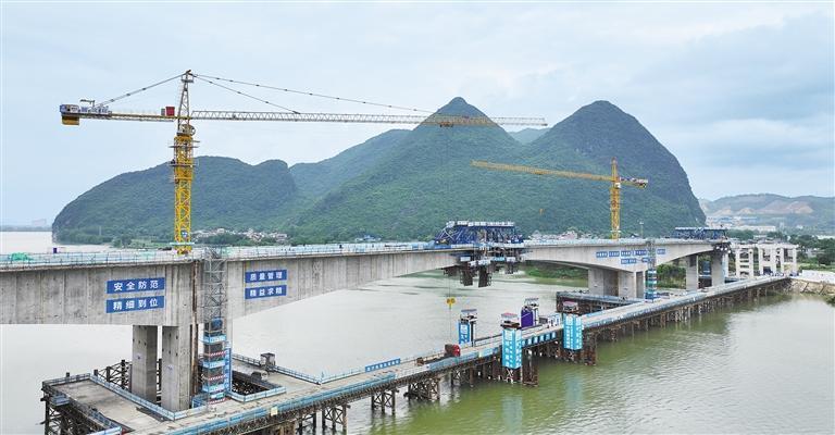 5月19日,位于广西柳州市融安县浮石镇的融福高速公路融江特大桥建设现场,工人正在施工作业。该高速公路起于柳州市融安县浮石镇隘口村,终于桂林市临桂区六塘镇峦山底村,建成通车后,将有力带动沿线旅游业发展。谭克兴摄(中经视觉)