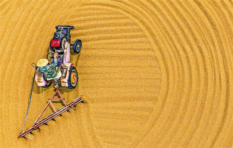 五月二十二日,安徽省合肥市庐江县,农民抢抓晴好天气翻晒小麦。当下,庐江县五十多万亩小麦全面进入收获期,该县农业部门组织五千多台(套)大中小型农业机械,协助农民抢收小麦。左学长摄(中经视觉)