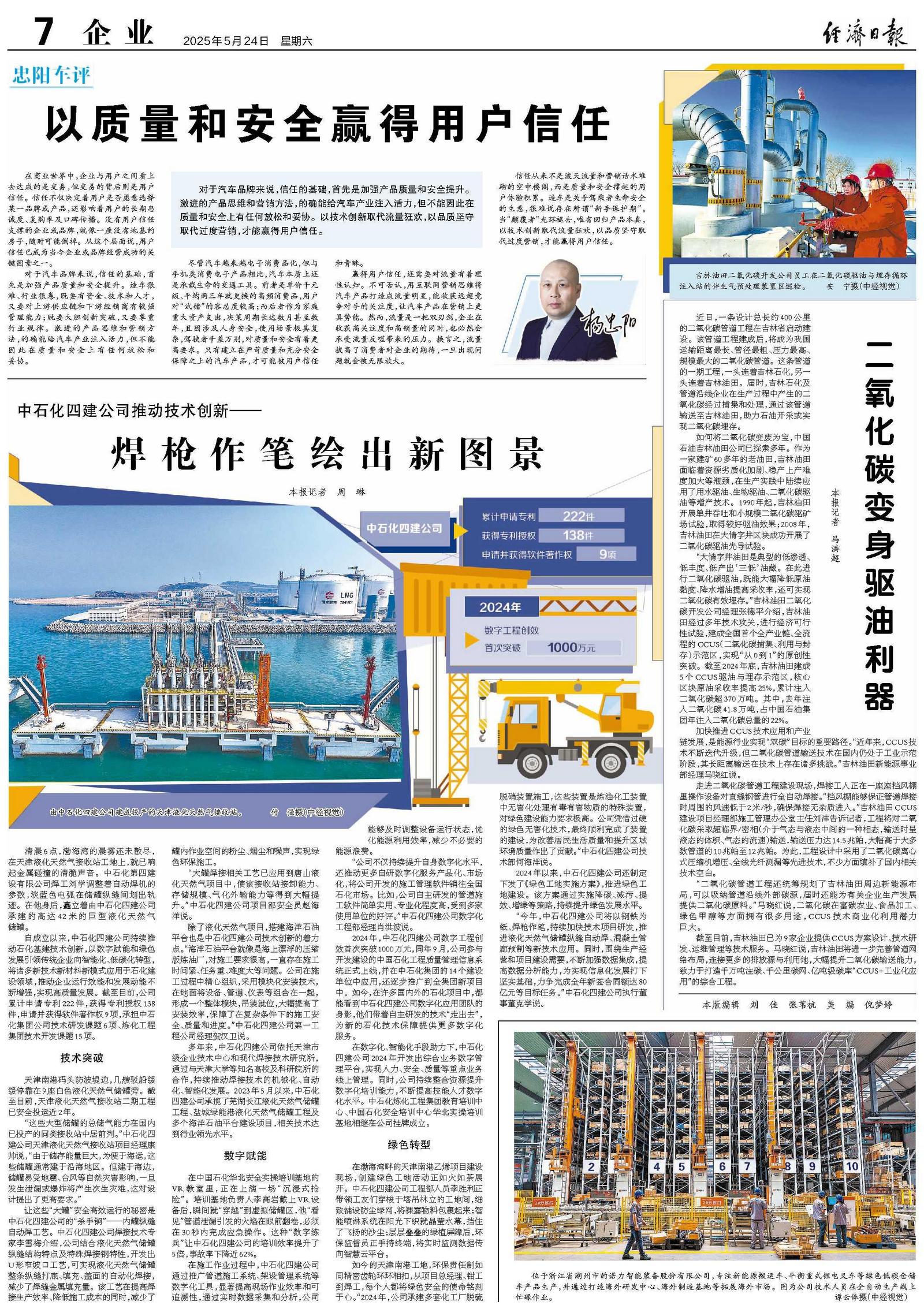 “大情字井油田是典型的低渗透、低丰度、低产出‘三低’油藏。在此进行二氧化碳驱油,既能大幅降低原油黏度、降水增油提高采收率,还可实现二氧化碳有效埋存。”吉林油田二氧化碳开发公司经理张德平介绍,吉林油田经过多年技术攻关,进行经济可行性试验,建成全国首个全产业链、全流程的CCUS(二氧化碳捕集、利用与封存)示范区,实现“从0到1”的原创性突破。截至2024年底,吉林油田建成5个CCUS驱油与埋存示范区,核心区块原油采收率提高25%,累计注入二氧化碳超370万吨。其中,去年注入二氧化碳41.8万吨,占中国石油集团年注入二氧化碳总量的22%。