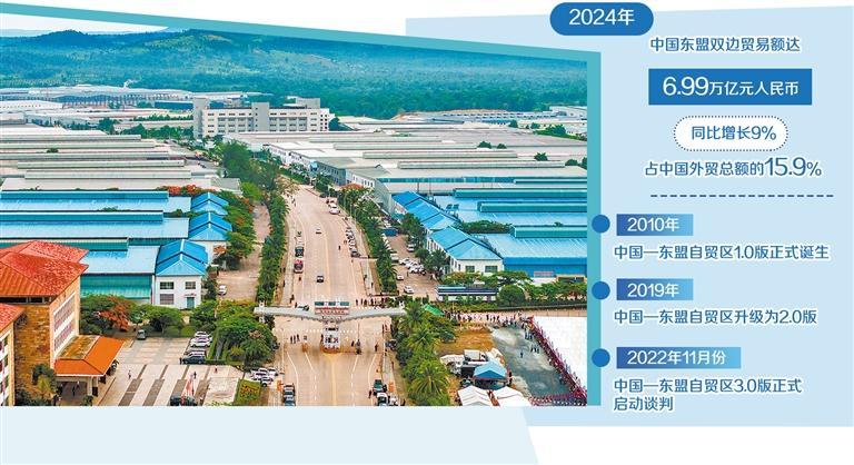 2002年,中国与东盟十国开启自贸区建设征程,先后达成并实施货物贸易协议、服务贸易协议和投资协议,2010年中国—东盟自贸区全面建成,货物贸易零关税覆盖双方90%以上的税目产品,中国—东盟自贸区1.0版正式诞生;2015年,双方达成升级协议,2019年全面实施,升级为2.0版,市场开放程度进一步提高;2021年,中方提出尽早启动3.0版建设,得到各国积极响应,2022年11月份正式启动谈判,历经近两年时间,于2024年10月份实质性结束,直至如今全面完成谈判。