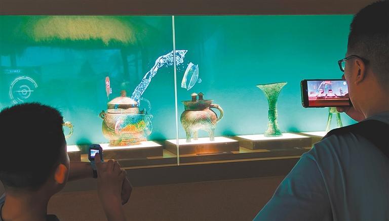 ◀5月1日,河南省安阳市殷墟博物馆,游客通过透明LED屏与数字虚拟影像结合的方式了解青铜器用途。